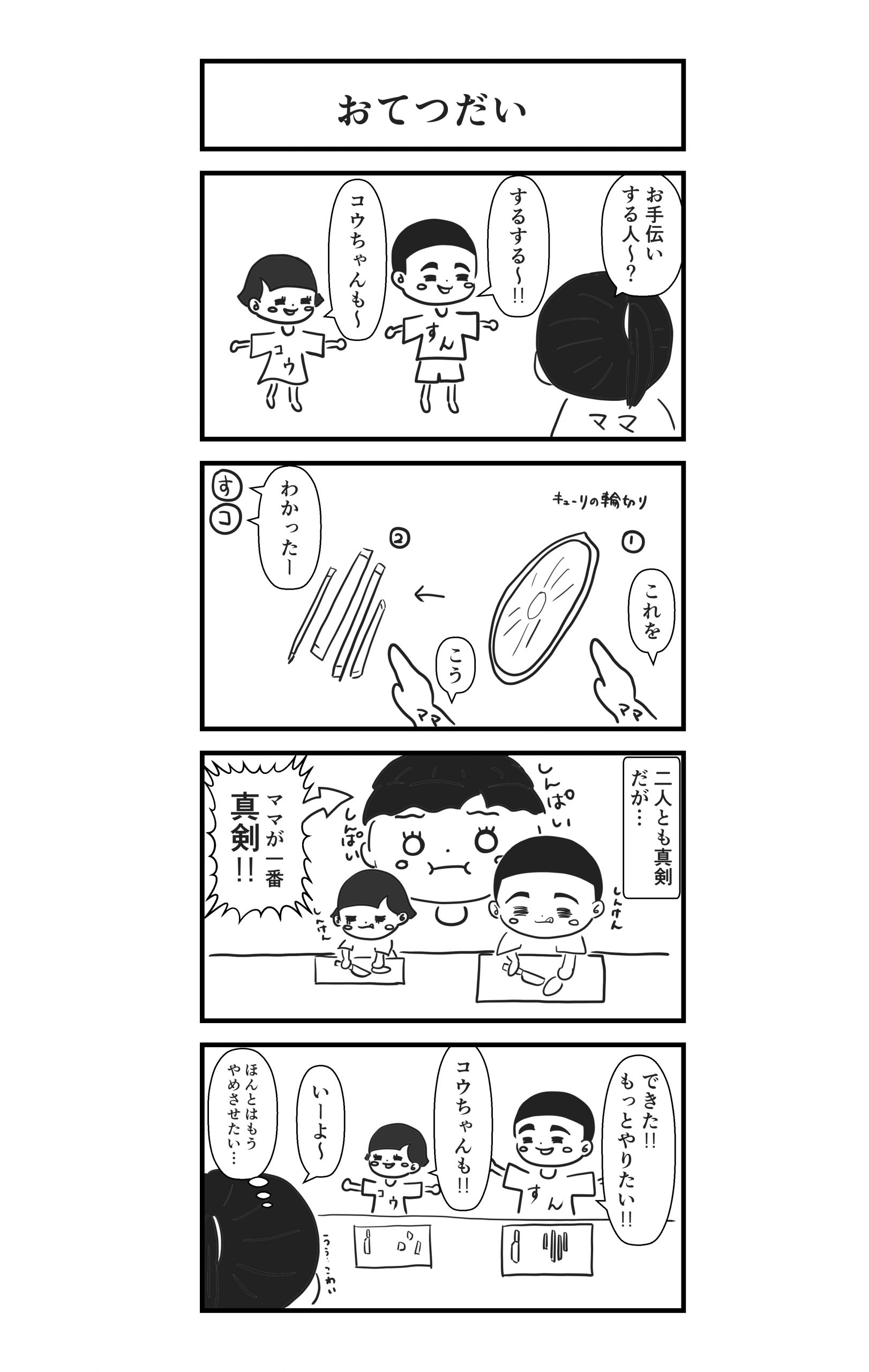 今回はこの、「できればやらせたくないけど、ずっと動画見てるよりいいし、見てるこっちが心配になるけどそこは親(私)の修行」と思ってさせているお手伝いについて、4コマにしてみました。